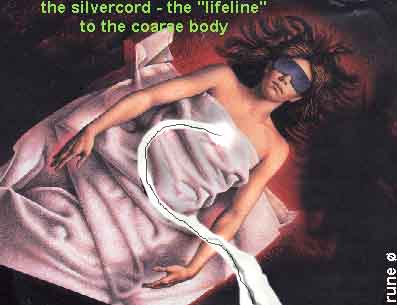 en tenkt ut-av-kroppen opplevelse der hun fra sitt frigjorte astrale legeme ser ned på den fysiske kroppen. Alle "frekvenslagene" i totalkroppen får sin livskraft gjennom denne energiledning fra overselvet.