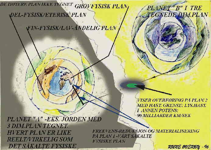vi ser her innerst vårt kjente jordplan - som folk flest tror er det eneste som finnes. Utenfor dette finnes mer høyfrekvente dimensjonsplan i lag lik som en løk. De ytre gjennomtrenger delvis de indre - og kan slik påvirke disse underliggende livsplan. Det finnes også to plan i lavere frekvensskikt "under" vårt såkalte fysisk plan. På disse finnes de såkalte naturvesener som kan virke dirkekte inn også på dette "vårt plan".Det finnes visse dimensjonsporter som knytter de overliggende dimensjonene sammen. Det er gjennom disse at de fleste ufo-er kommer inn i vår verden og senere "reiser tilbake".