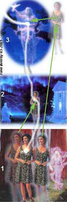 the white line between the bodies in the diff. planes - is the etheric line - "the silvercord" which connects the physical body to the higher dim.body while "in carno". On this plane - 3-left- she can take other outer forms - controlled directly by the mindforce. The white line out to the left on picture 3 is the mainline/silvercord to the overself which connects all the different bodylayers and give them real LIFE.