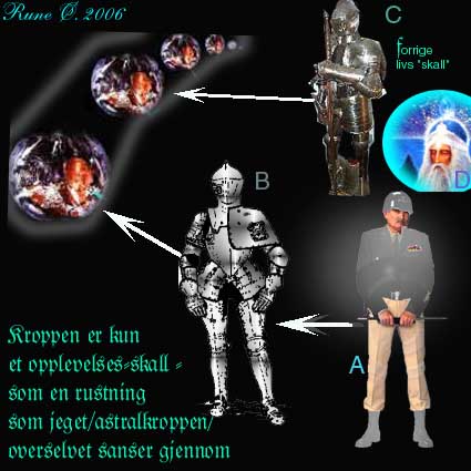 kroppen er kun et opplevelsesredskap eller "skall" - her symbolisert med rustningn -som "vesenet inni" - her A/astralkroppen -  bruker for å få livopplevelser på dette tunge læreplan som vi kaller "jorden". Men det virkelige vesen bak "A" befinner seg på planet D som er det egentlige selv -kalt OVERSELVET - som er forbundet til materie-kroppne via den åndelige energiledning kalt "sølvsnoren".Samme A hadde i siste liv et annet redskap - C- rustningen som var et "annet skall" som ble brukt i siste "skoletime" (forrige liv).