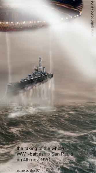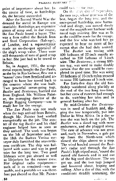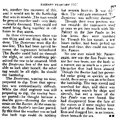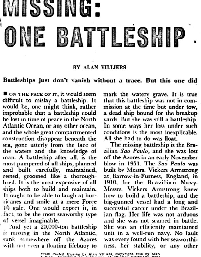 Sure enough, after rummaging quickly through the piles of books, I came across a February, 1957 issue of PAGEANT magazine, just what I was instructed to look for. In it, I found a reprint article entitled, “MISSING – ONE BATTLESHIP”. Here was the story of the mysterious disappearance of the Brazilian battleship, Sao Paulo, as related by the crews of the tugboats. I read it hurriedly: It was just as my space friend said it was, at least the part that was apparent to the people who did the investigation of the disappearance. They could only be objective, bur I know the REAL story, and an incredible one at that! I have included the article forthcoming in this book so everyone may see for themselves.
