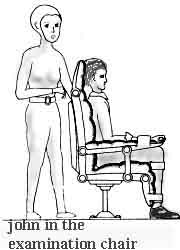 John sat down as he was told: Serkilias pulled back his shirt-sleeves to expose his wrists (it was a warm night, and he was not wearing a jacket); and she made sure that his wrists were in exactly the right position on the armrests of the chair. Although he did not see her put them on, he found later that each wrist was secured to the armrest by a flexible band, about four to five inches long, so that his arms were gripped securely but not too tightly.