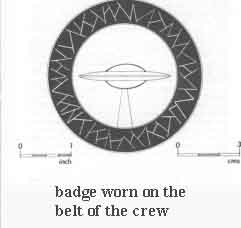 John said that he had at one point a good close look at the badge on the belt worn by Serkilias. It was circular, slightly wider than the belt, about three inches diameter: the design consisted of a white disc bearing a stylised representation of a 'flying saucer' ship such as the one they were in, as seen in side view; from the centre of the under side, lines representing the limits of a slightly divergent beam extended to the limit of the disc, in a downward direction. The design was delineated in black lines. Surrounding the white disc was a narrow black annular zone, perhaps half an inch wide; it bore a number of short straight silver lines, set at odd angles, forming a kind of pattern all the way round. John said it was not regular enough to be a pattern; he had a feeling that it was writing, that it meant something.
