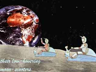 It was Bob’s first time "out in the open". The sun was in the lower eastern sky and the shadows were pure black. He climbed off his scooter and stood on the surface of the Moon, It crunched under his feet like fine sharp gravel. The low gravity enabled him to stand with no effort at all. He picked up a big rock, which should have weighed over ten pounds and threw it upwards some feet and it descended slowly, as in a slow motion picture. It landed a number of feet away, bounced of another rock some ten feet and landed in a small puff of dust, which settled back promptly, but he could feel no trace of atmosphere. It would not be breathable, but might be capable of carrying dust some distance.
