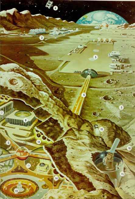 Next, they went into a beautiful room called the Observation Deck. Around the outer rim was a 10-foot high window, looking out on the Moon surface. The sun was low on he western horizon, casting strange shadows on the floor of the crater. From their elevated level they could see most of the floor of Plato. It is about 700 miles from the north pole. In the southern star filled sky, Earth shown down on them - an azure ball of subdued radiance in the sunlight. They watched it in perfect peace. (Renaud is a true poet, but this is only a summary of his full report.)