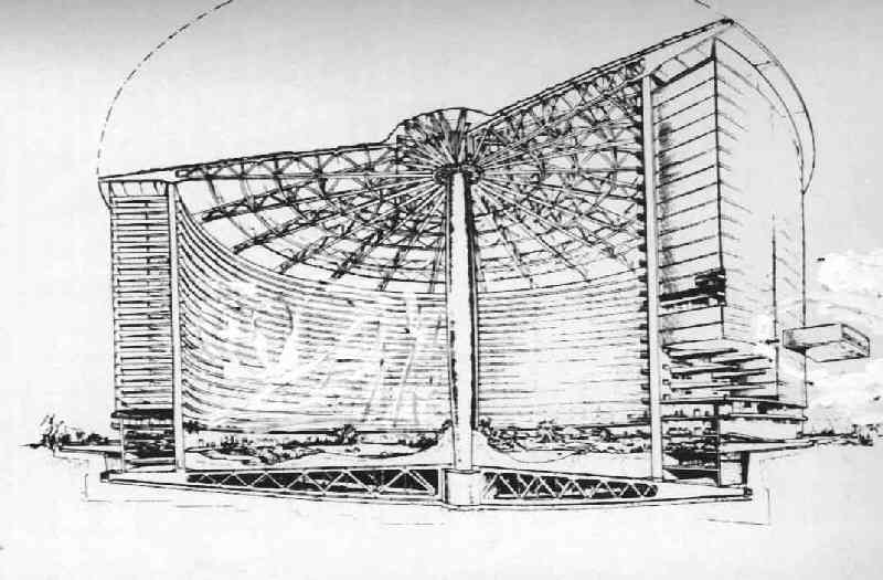 On the out side of this cylindrical wall were rows of heavy support beams, onto which the house units were placed, each unit fitting perfectly against the insulated surfaces of its neighbour. If one of the units should be damaged at any time, for example by fire, then it was simply removed and a new one put in its place. A wonderful piece of engineering. (see picture below)