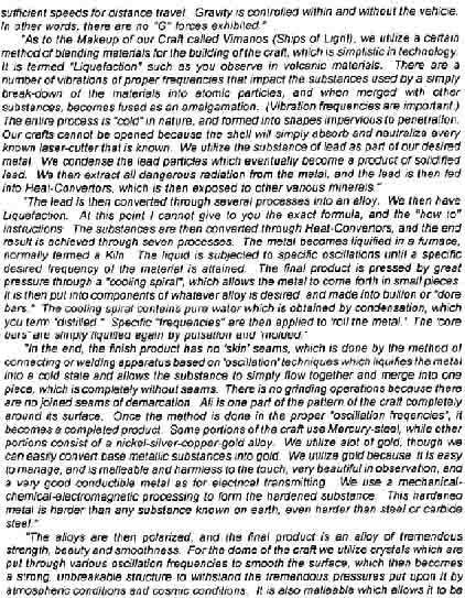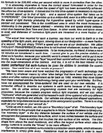 ‘…we have been aware and have watched the progression of earth tech.that was taken by whatever means by other ‘alien beings’ – that have been captured by your and other nations of government as far back as 1960, whereby they have copied from these crashed vehicles the (high)-tech. being used upon your world today. But they have not accomplished the ‘drive-systems’ that are used on our own vehicles. It is somewhat difficult to describe our systems in earth terms, because of the language barrier. We do utilize programming crystals that are necessary for flight propulsion, because the crystals program various light impulses, and we also utilize ‘tacheons’- which are generated and harnessed in both systems….Our vehicles are always disc-shaped applications, esp.for long-distance travel, because of the aeronautic qualities. There is no drag such as your wings on your aircraft do”….