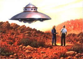 It wasn't just women however, who had erotic adventures with ufonauts. Eugene Browne, of Antrim, Northern Ireland, had a surprising adventure to relate. In the autumn of 1967 he wrote to Flying Saucer Review claiming that the previous 17th July he was walking in a wood near his house when he saw a dull blue-grey dish-like object with a rough and pitted outer surface, hovering just above the ground. From an opening in the centre two human shaped beings, dressed in silvery suits, floated to the ground and walked into the woods. Shortly afterwards they returned and floated back up again. [5]
