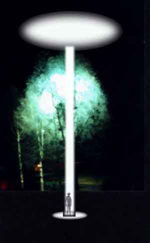 [They describe it as] 'a top-shaped ship with a row of lights around the circumference'. (This is a fluorescent light which can fluctuate between dim and very bright.) One evening as the Does were watching the ship, an airplane approached and the object's lights immediately went out. As the airplane passed the lights went back on ... A strong beam of light projected from the ship late one night as Mrs doe and her daughter 'Emma' slept in the front part of the house. They both awakened to see the beam of light about three inches in diameter pointing at their feet at the end of the bed. They both rose and ... the light followed them around the room ... Mrs Doe thinks the occupants of the craft were trying to see what human life looks like. (The full brightness of the light turns night into day.)