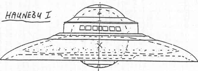 In August 1939 the first RFZ 5 took off. It was an armed flying gyro with the odd name "HAUNEBU I". It was twenty-five metres across and carried a crew of eight. At first it reached a speed of 4,800 km/h, later up to 17,000 km/h. It was equipped with two 6 cm KSK ("Kraftstrahlkanonen", power ray guns) in revolving towers and four machine guns 106. It had a 60% space capability.