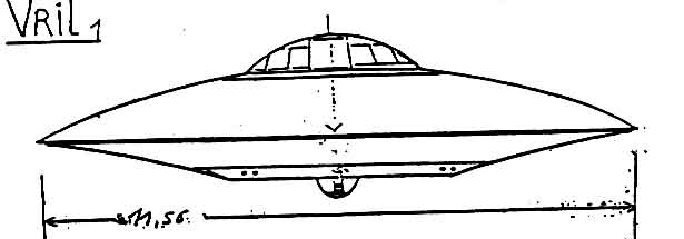 After the success of the small RFZ 2 as a distant reconnoitre craft the VrilGesellschaft got its own test area in Brandenburg. By the end of 1942 the lightly armed 'WRIL-1-Jager" (VRIL-1 fighter) was airborne. It measured 11.5 metres across, carried one person, had a "Schumann-Levitator" drive and a "maguetic field impulse steering unit". It reached speeds of 2,900 to 12,000 km/h, could change direction at a right angle at full speed without affecting the pilot, could fly in any weather and had a 100% space capability. Seventeen VRIL-1's were built and same versions had two seats and glass domes.